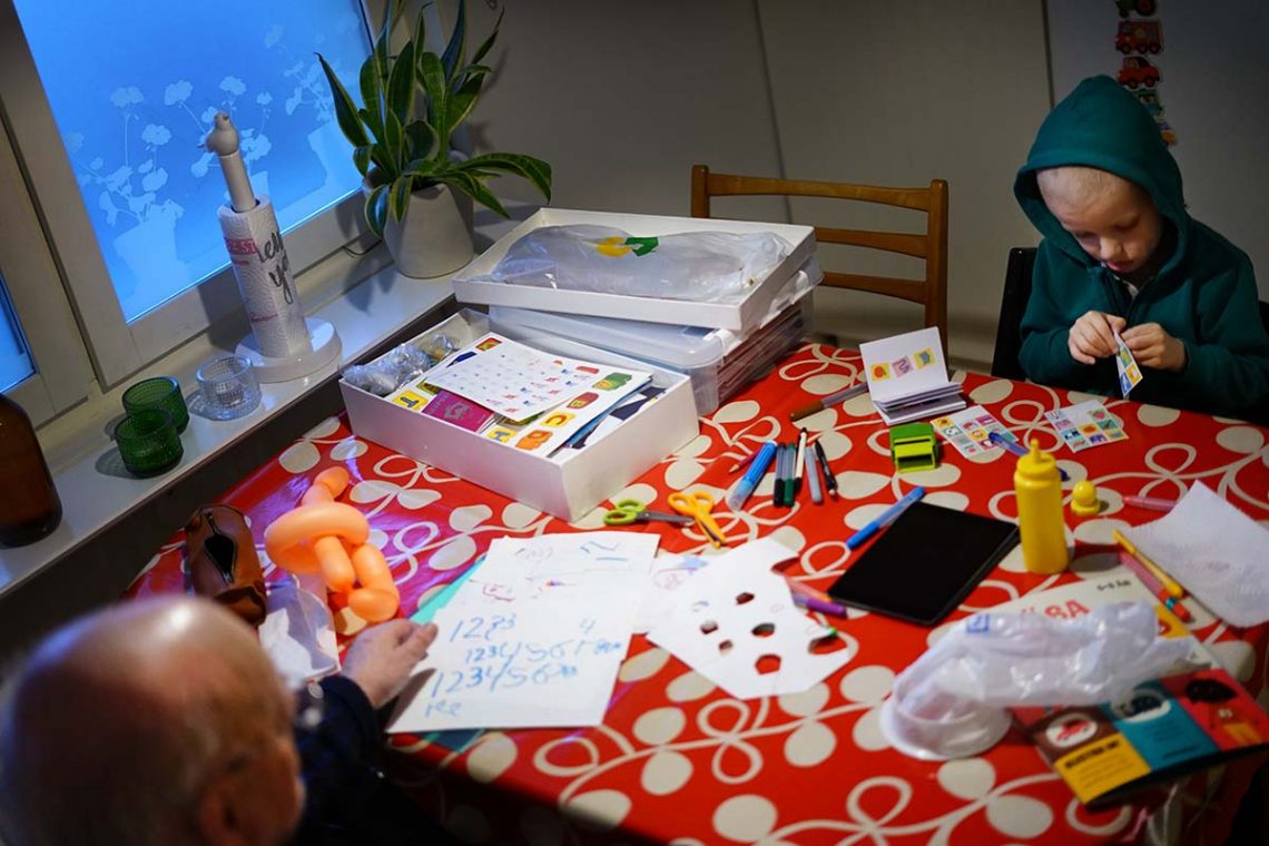 2018-01-31 Elis fick en stämpel med fotbollsmotiv i stickpresent så nu sitter han med blå fotbollar på kinderna och leker…